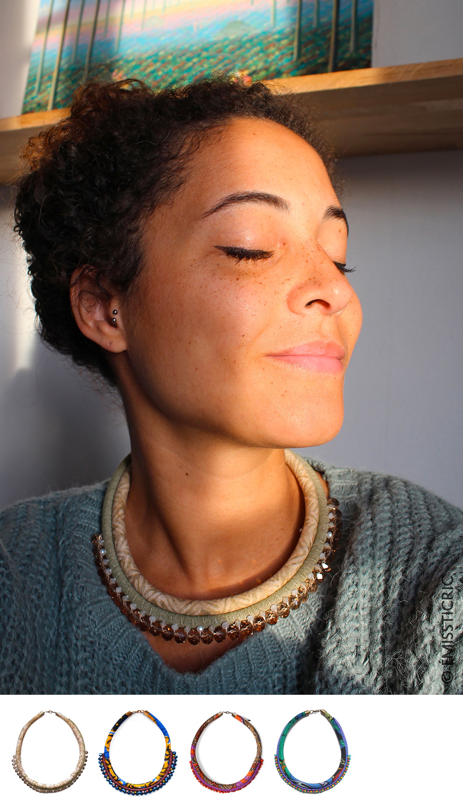 - Guada : tissus upcyclés, perles de verre et Swarovski.